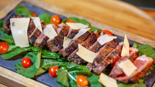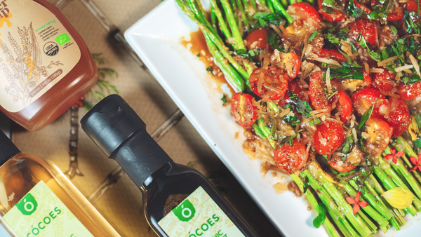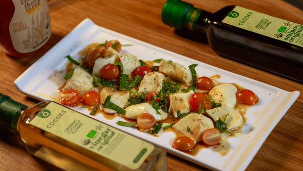 This rustic Italian dish features tender, pan-seared steak drizzled with a rich, savory CÓCOES Organic Coconut Flower Aminos, served atop a bed of peppery arugula, and finished with shaved Parmesan and fresh cherry tomatoes.