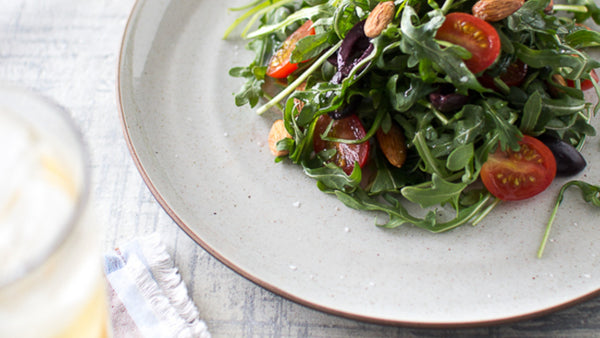 This arugula salad has a tasty blend of peppery arugula, cherry tomatoes, and toasted almonds. It’s finished with a refreshing, tart, and lightly sweetened dressing to highlight it.