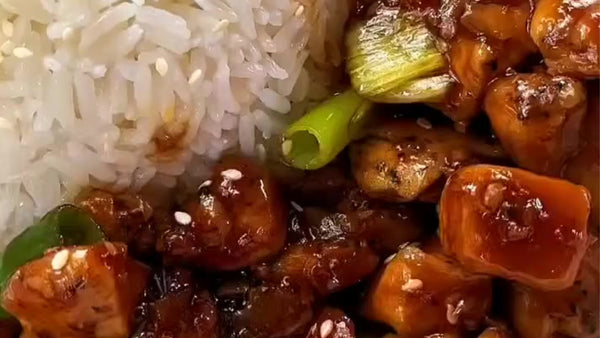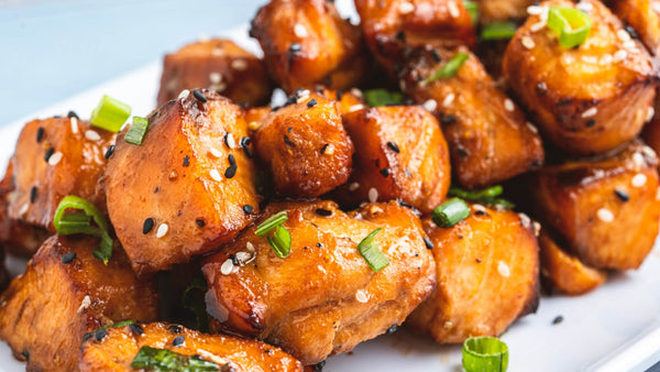 These bite-sized salmon nuggets get a delightful crispy coating before being bathed in a sweet and tangy ginger glaze. Served over fluffy rice with tender edamame, they offer a well-balanced and flavorful meal that's sure to impress.