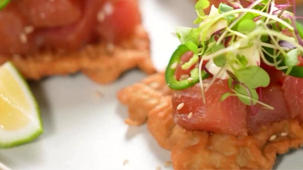 These bite-sized wonders combine the crisp crunch of nori seaweed with the delicate dance of sashimi-grade tuna, marinated in a sweet and savory glaze. Coconut flower aminos, mirin, and lime juice mingle with sesame oil and a touch of sugar, creating a vibrant canvas for the tuna to sing. Japanese mayo, spicy jalapenos, and fresh microgreens add unexpected twists of flavor and texture, making these Nori Tostada Bites perfect for appetizers or a light and satisfying meal.