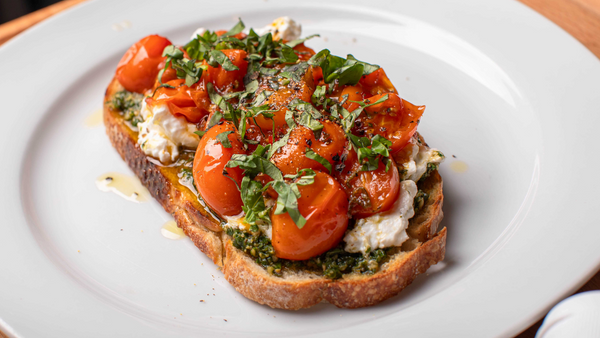 This open-faced toast features a delightful interplay of textures and flavors. Creamy burrata cheese melts onto toasted bread, balanced by the acidity of heirloom tomatoes and a sweet and tangy aminos vinaigrette.