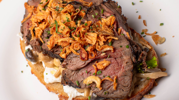 Steak, Mushroom and Burrata Open Faced Sandwich